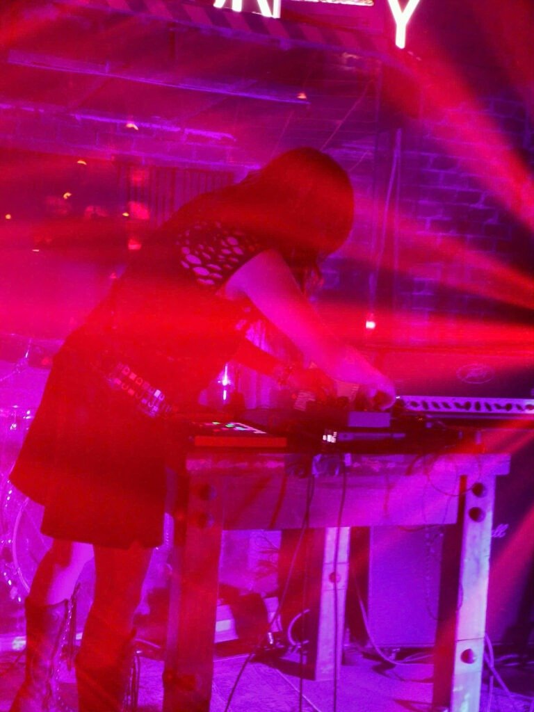After sitting in the dark and absorbing a half-decade’s worth of high-stakes concrete slams, the room was swimming in unspent adrenaline. The crowd needed a physical release valve. Enter Dis Fig and her noise rig. For those unfamiliar, she operates in the trenches of post-industrial noise, the exact kind of head-splitting, mechanical dread that made her collaborative album “Orchards of a Futile Heaven” so devastating. She commanded the room with a dark, inescapable gravity, staring down a setup that weaponized contrast. Her set layered crushing, industrial machinery beneath vocals that were melodic but deeply haunting. At times, the noise would recede into a deceptive, ambient quiet, anchored by heavy, droning accordion notes that felt more like a funeral dirge than an actual melody. But the tension was never meant to hold. The set flatlined into absolute chaos the second Dis Fig abandoned the stage and threw herself straight into the crowd. The floor instantly collapsed into a suffocating, breathless crush of bodies. You were suddenly caught in a frantic shoving match, soundtracked by a relentless, metallic pulse that felt ripped straight from the climax of a slasher film. It was a sweat-drenched exorcism entirely uncompromised, and exactly what disturbing the peace is supposed to look like.