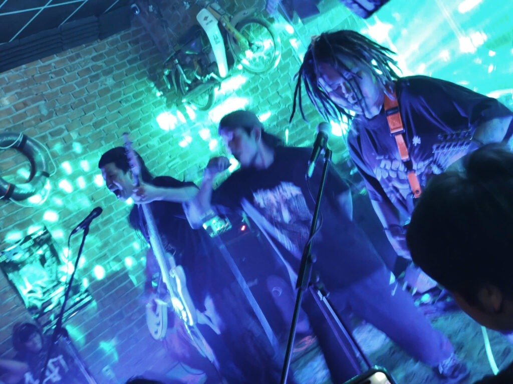 Through the strobe-heavy, scattered analog TVs, distorted footage bled out, flashing the name Cút Lộn through the static. The band needs no introduction, with their sweat and dedication to the local underground are practically baked into the scene’s foundation. The turnout was noticeably thin, and the bodies that did show up carried a weirdly polite hesitation, as if everyone were suddenly afraid of bumping shoulders and “bothering” the person standing next to them. The band refused to accept that. They threw themselves against the room’s physical limits, sprinting across the floor, tearing at their vocal cords, and punishing their instruments with absolute brute force, trying to wrench a reaction from the crowd. They didn’t get the floor-clearing pit the music demanded, but the room didn’t flatline, either. Instead, a different kind of engagement, people shouting back lyrics and swaying heavily to the rhythm, absorbing the abrasive noise on their own terms.